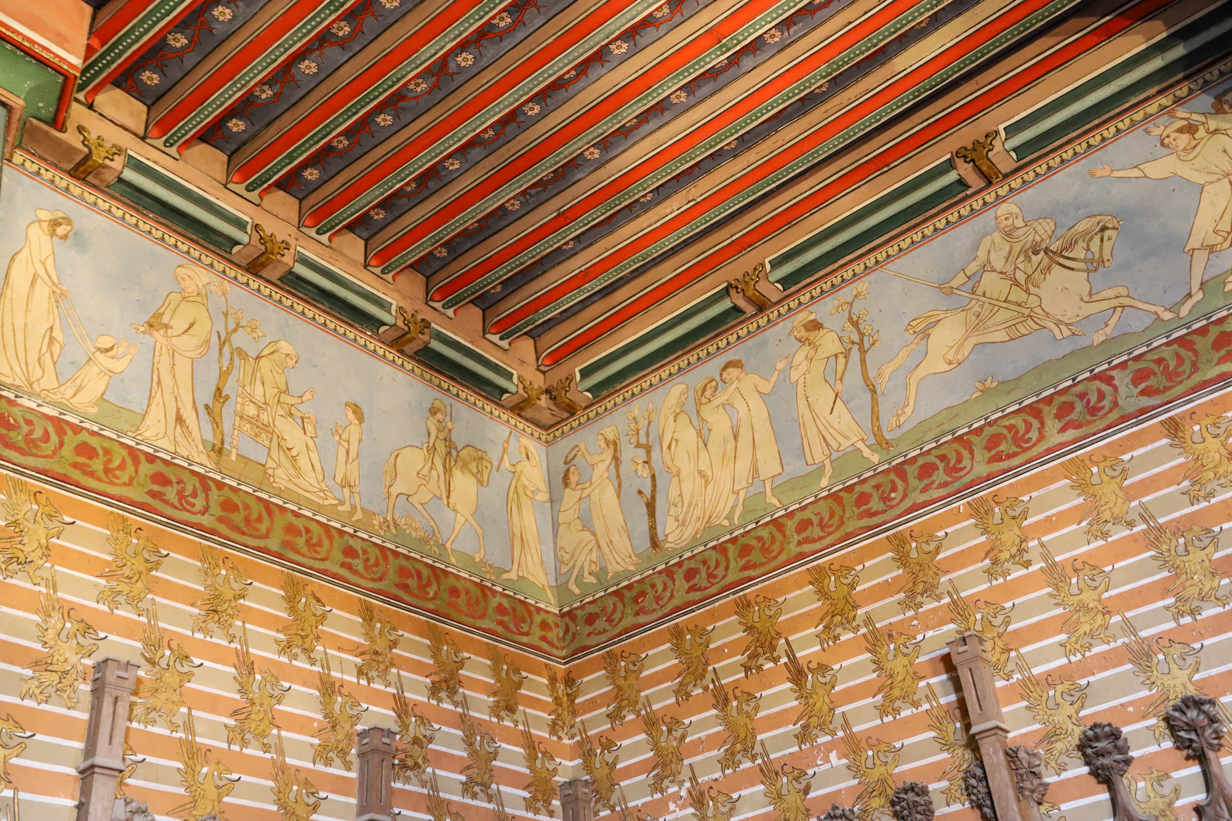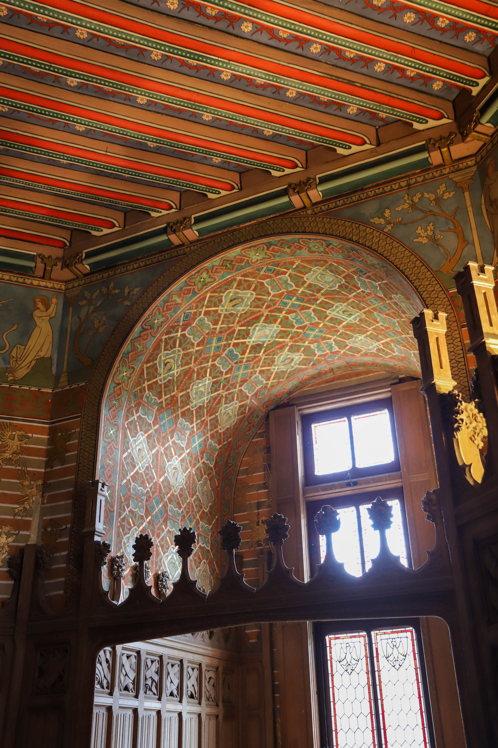 Cette pièce emblématique du château de Pierrefonds est la salle des Preuses. Sa voûte est en forme de coque de bateau renversé, elle mesure 53 mètres de long, 12 mètres de haut et 10 mètres de large. Malheureusement nous n’avons pas pu la visiter, elle est fermée depuis l’année dernière pour cause de travaux. Elle réouvrira normalement en 2024. Sur le site du centre des monuments nationaux vous pourrez néanmoins voir quelques photos.